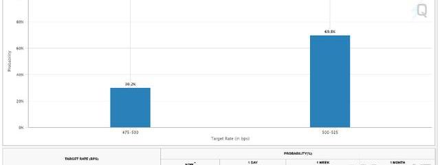 因此,美國利率期貨市場對下屆聯邦公開市場委員會加息50個基點的預期躍升至69.8%。前日為31.4%,上月為9.2%,可見開始迅速納入。