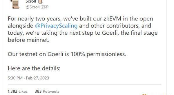 Scroll剛剛發布了GoerlizkEVM測試網,這是主網發布前的最后一步: