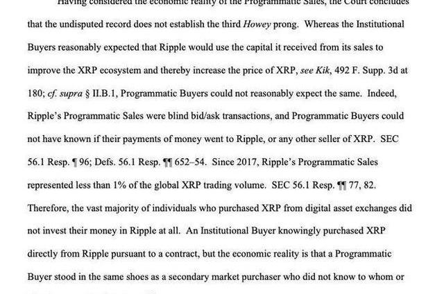法庭認為,機構買家合理地預期,Ripple將利用其從銷售中獲得的資金來改善瑞波幣的生態系統,從而提高XRP的價格。但是,程序化買家不可能合理地期望同樣的結果。“Ripple的程序化銷售是盲目的買賣交易,程序化買家不知道他們的錢是否流向了XRP或任何其他XRP的賣家。