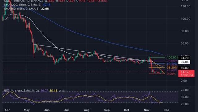 由于市場繼續處于不確定狀態,SOL的價格從35美元跌至11美元后,SOL的價格在每日時間框架內仍然相當疲軟,因為價格交易在14美元以上。