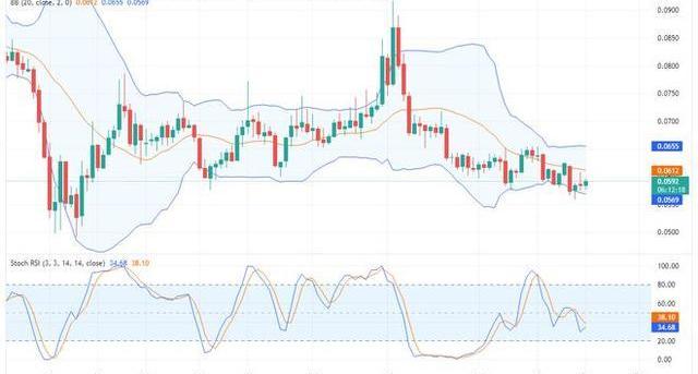 今天在DOGE/USD的日線圖上,有跡象表明當前的價格走勢可能會走高。該圖表上的最后三個蠟燭,表明買家的活動,因為他們正在逐步向上推高。盡管價格走勢仍在布林線指標的均線下方,但隨機指標可能帶來一線希望。可以看到RSI在38%和35%的水平上相互轉向。當它們相互交叉時,價格活動將呈上升趨勢。因此,上漲趨勢將繼續。然而,由于該線仍低于50%,這一趨勢仍可被視為疲軟。盡管如此,交易者可以預測價格將達到0.0630美元以上。