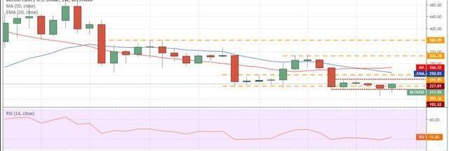 BCH/USD每周圖表,來源:Tradingview過去幾周,BCH/USD貨幣對一直在227.01美元至192.52美元之間波動。盡管空頭在過去兩周跌破192.52美元,但它們無法維持較低水平,這表明多頭正在利用逢低買入。