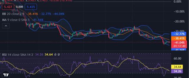 RSI指標目前處于42.21水平,這是一個中性區域,這表明市場既沒有超買也沒有超賣。由于布林帶收窄,波動性較低,這表明價格波動較低。在24小時圖上,布林帶指標的上限現在為5.54美元,而下限為5.27美元。