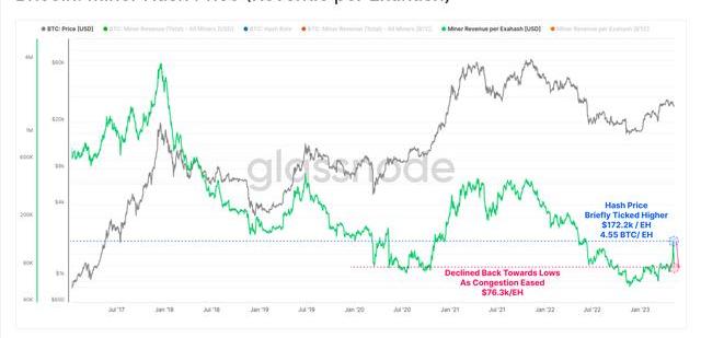 本周哈希價格短暫上漲至17.22萬美元/EH,但隨著費用壓力消退,此后暴跌55%至7.63萬美元/EH。雖然這種區塊空間需求的爆發為礦工收入帶來了積極的增長,但到目前為止它是短暫的,并且與哈希價格的無情下降趨勢相比顯得蒼白無力。