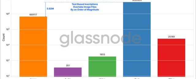 結果,迄今為止,文字題詞的總數已超過圖像題詞的總數,超過了500萬。現在,基于文本的銘文比基于圖像的銘文多了幾乎一個數量級,寫入比特幣區塊鏈的文本文件總數達到了569萬個。