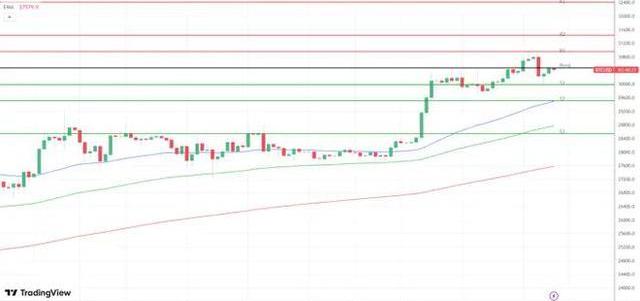 保持高于主要支撐位和50日均線將支持從R1突破至R2和31,500美元的目標。然而,跌破S1將使S2和50天EMA進入視野。跌破50日均線將發出看跌信號。