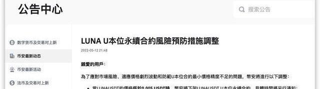 隨后,幣安發布LUNAU本位永續合約風險預防措施調整,指出當LUNAUSDT的價格低于0.005USDT時,將下架LUNAUSDTU本位永續合約。
