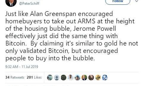 “就像格林斯潘鼓勵購房者在房地產泡沫高峰時期,取出ARMS一樣,鮑威爾實際上只對比特幣做了同樣的事情。通過聲稱它與黃金相似,他不僅驗證了比特幣,還鼓勵人們買入泡沫。”