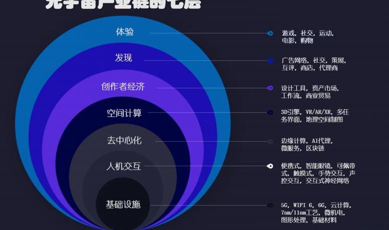 華西證券研究所的一份資料寫道,根據元宇宙所需的各項技術,可以將元宇宙產業鏈分為七個層次,分別是: