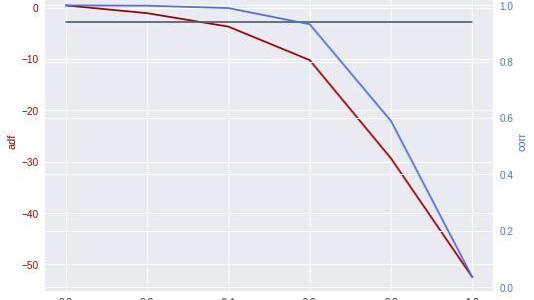 為了說明平穩性和記憶之間的權衡,我們可以進行適當的可視化,并將ADF測試統計數據以及與原始序列的相關性繪制成具有不同階差變換的序列。。