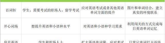 百詞斬:面向各類英語考試的大殺器;開心詞場:以記憶單詞為切入點打開在線教育課程;扇貝單詞:記憶打卡為特色,在線課程為輔導的在線英語app;