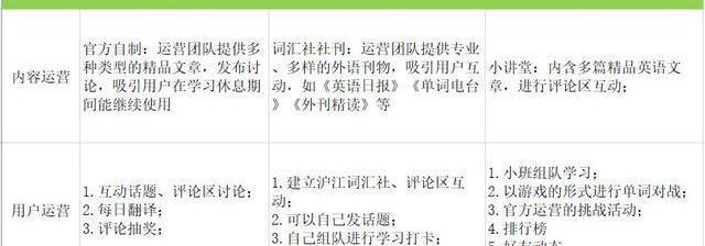 對比來看:三者的對于APP內部的運營策略大致方向是相同的,但是開心詞場依靠背后滬江網校的得天獨厚的優勢,參與多樣化的內容運營,整合優質的英語學習資源,提供了多種類型的活動,形成以單詞記憶為核心的綜合性在線教育內容矩陣,與其打造綜合類在線產品的產品定位也相符合。