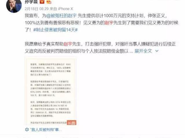 今年2月,福州趙宇因阻止一起強奸誤傷歹徒而被逮捕,孫晨宇再次單方面宣布出資1000萬為見義勇為的趙宇“主持公道”。這條微博,轉發6萬+,評論6000+,點贊20萬+。