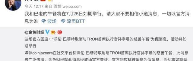 “我和巴老的午餐將會在7月25日如期舉行,不要聽信小道消息。”