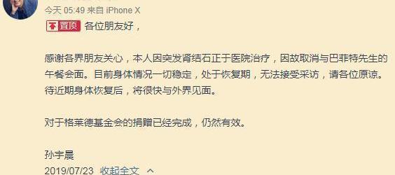 孫宇晨是知名90后創業者之一,波場TRON基金會創始人。6月4日,孫宇晨宣布以破紀錄的4567888美元天價拍下沃倫·巴菲特20周年慈善午宴。但在巴菲特午餐會即將召開之際,7月23日凌晨,孫宇晨通過微博表示,因突發腎結石正于醫院治療,取消了與巴菲特的午餐會面,但表示對格萊德基金會的捐贈仍然有效。不過波場在回復《每日經濟新聞》記者采訪時表示,午餐不是取消而是推遲。此外,格萊德基金會方面在接受《每日經濟新聞》記者采訪時表示,該基金會已經知悉孫宇晨與巴菲特的午餐會被推遲,不過其已經收到了孫宇晨和其公司的全部4567888美元捐款。此外,該基金會還對孫宇晨慷慨的捐款表示了感謝。