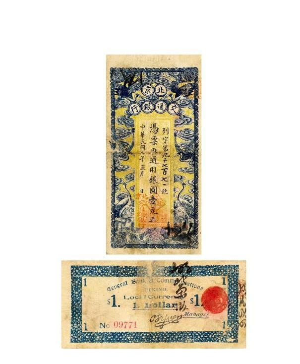 民國元年北京交通銀行大銀圓券壹元一枚,祥云仙鶴圖,直型,列字第九千七百七一號,正式流通券。交通銀行成立于光緒三十二年,經營路、電、郵、航四政的收支業務。民國成立后,該行繼續經營,并改發通用銀元票,又稱大銀元票,計有壹圓、伍圓、拾圓三等面值券。紙幣圖案舍棄龍圖,改用鶴圖。