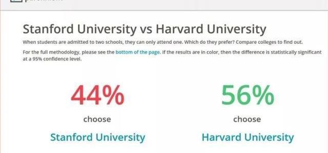哈佛的確在各個方面要超過斯坦福,那在現實世界中,如果學生真的被兩所學校都錄取了,學生會如何選擇呢?關于這個1對1PK指數,Parchment網站,提供1對1PK指數。結果是這樣的。