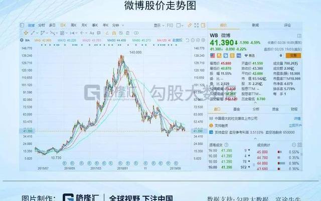 財報之后,微博股價盤前一度大跌10%以上,但開盤后一度翻紅,最后收盤下跌-4.59%至41.39美元。可見市場對于微博目前估值的爭議很大。