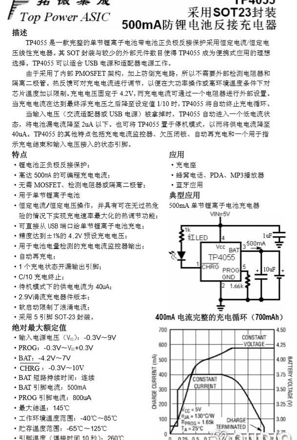 拓微TP4055500mA,防反接鋰電池線性充電IC。