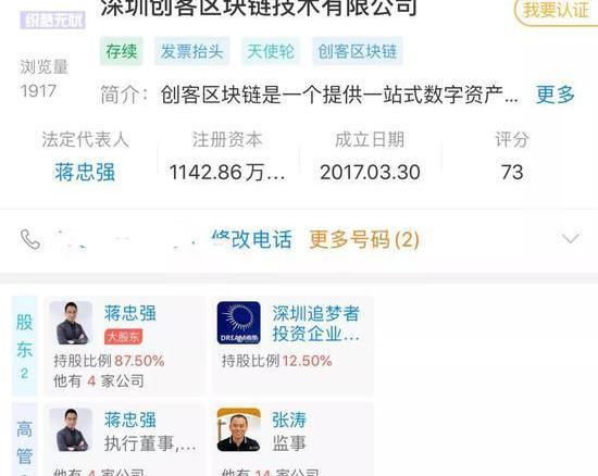 首先是深圳創客區塊鏈技術有限公司,張濤擔任該公司監事。根據簡介,創客區塊鏈是提供一站式數字資產與區塊鏈解決方案提供商,主要以區塊鏈中間件為服務。核心業務包含:開發數字資產交易系統、企業私鏈、聯盟鏈、公鏈的開發以及周邊APP開發等。