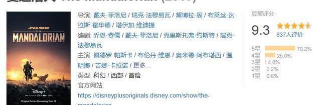 好吧這些都不重要,真正應該令網飛戰栗的是,迪士尼首部以《星球大戰》世界為背景的原創劇集《曼達洛人》,上線就是豆瓣9.3,IMDb9.2,爛番茄94%。換句話說,一開場,就是王炸神劇預定。