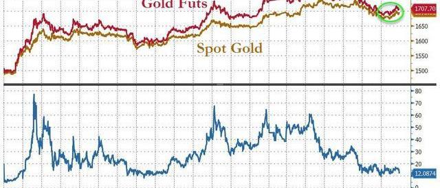 COMEX6月黃金期貨也重上1700美元,周一收漲0.7%,報1711.20美元/盎司。上周五黃金期貨收跌1.9%,報1698.80美元/盎司,連續第二日創4月8日以來收盤新低,上周累跌3.1%。不過截至上周二,期金已連續四日上漲,且連續三日創2012年10月以來主力合約收盤新高。期貨和現貨黃金的價差周一略有收窄。