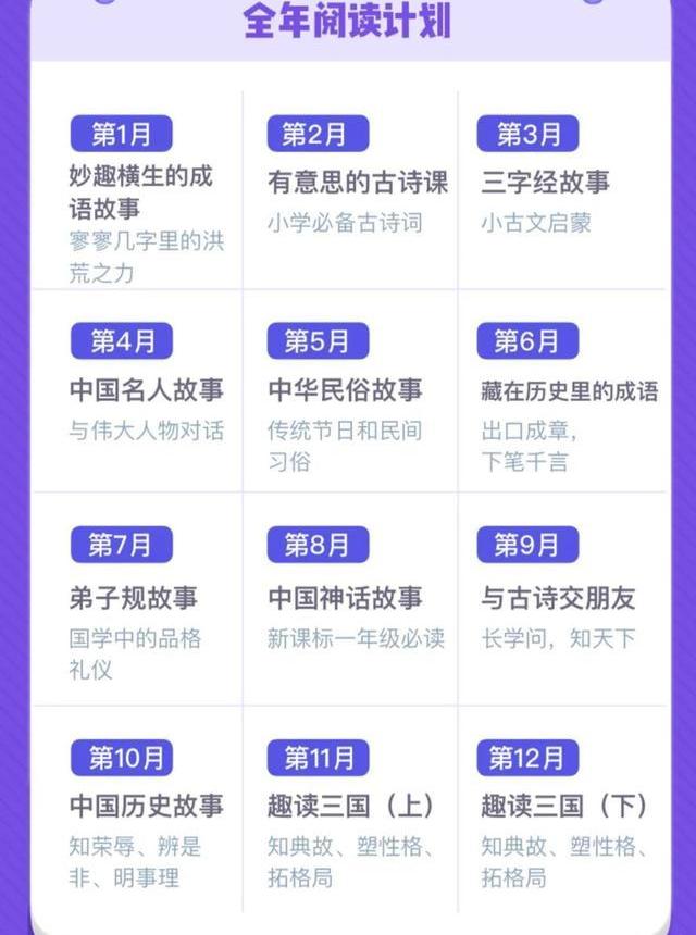 2、拓展課程。不僅是課內,還包括了西游記、三國等古今中外的文學知識,奧數等。打好基礎的同時,有一定的培優功能。