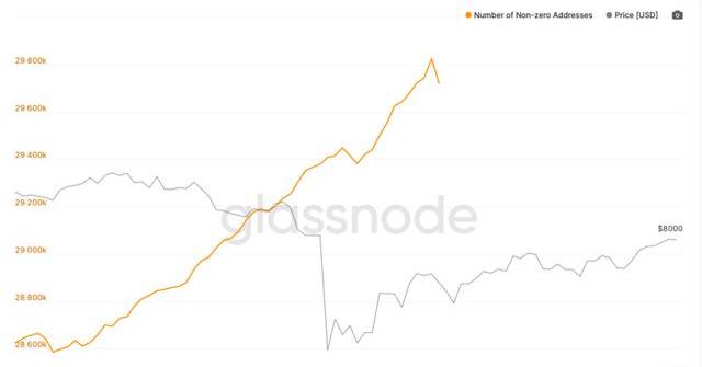 圖注:黃線代表比特幣非零地址數,灰線代表比特幣價格