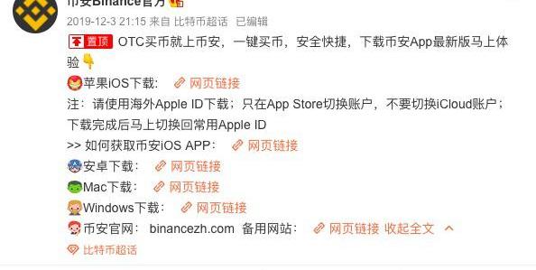 近日,微博認證為幣安創始人的cz_binance轉發了“幣安Binance官方”的多條微博。在“幣安Binance官方”的置頂微博中,記者看到,出現了“幣安官網:binancezh.com”等信息。
