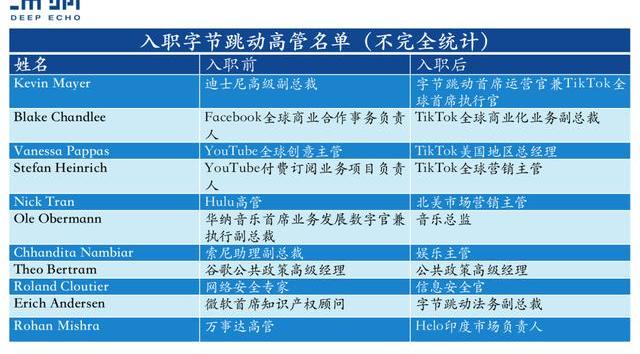當然,BlakeChandlee并不是TikTok招募的唯一精英高管,近年來字節跳動相繼從Facebook、YouTube、Hulu等多家巨頭公司找到不少人才,例如: