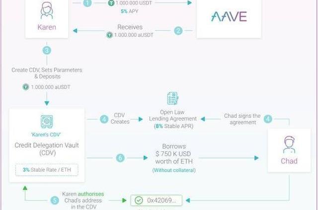 “存款人可以委托他們的信用額度,例如,凱倫向Aave存款一筆USDT,并將她的信用額度委托給查德,后者可以從Aave協議中提取ETH等資金。