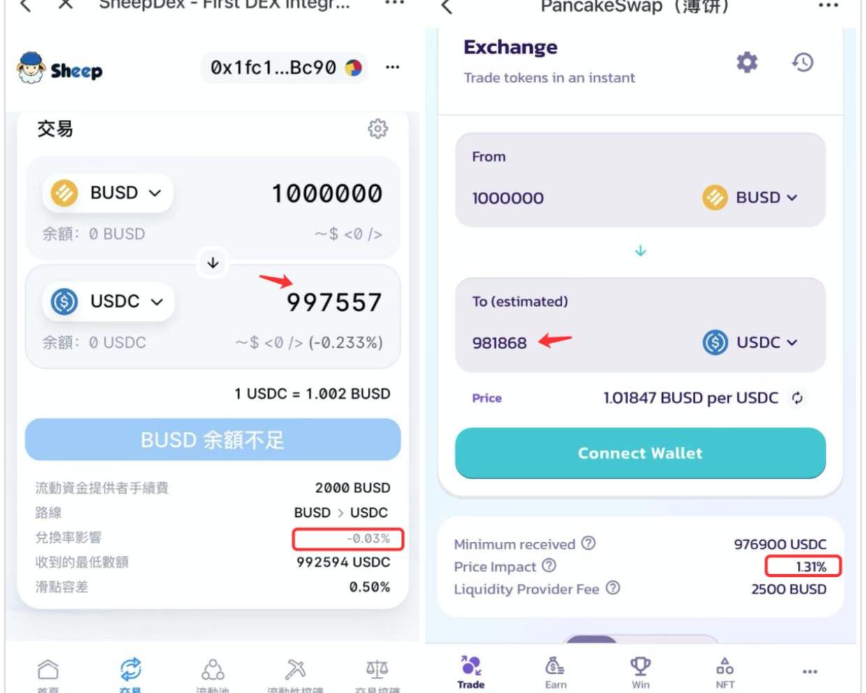 當我們在這兩個平臺交易100萬BUSD時,兩者的效果對比就更加明顯了,在SheepDex平臺將會比PancakeSwap平臺多兌換15689USDC,而且滑點差異也比較大。