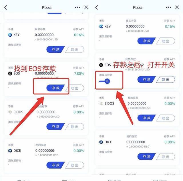 b)找到EOS選擇“存款”,存好自己的數量之后,打開“用作質押物”的開關;