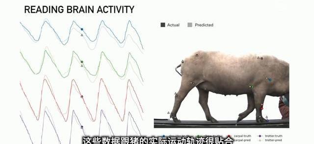 在演示腦機接口的信息讀取功能時,每當第三頭豬通過鼻子感知到了外在味覺的變化,腦機接口會實時發出嘀嘀嘀嘀的聲音,這就驗證了腦機接口確實可以接收到豬腦負責味覺神經元的電子信號,并將其翻譯成了機器語言,這些信息都可以存儲下來作為備份,待必要之時可隨時回寫。另外在實驗室,馬斯克團隊也做了一個實驗,他們將豬放到跑步機上,腦機接口可實時讀取豬腦對其四肢下達的運動指令,這些數據跟豬的實際運動軌跡很貼合,這也證明了腦機接口確實可以正確理解豬腦通過電子信號下達的指令。