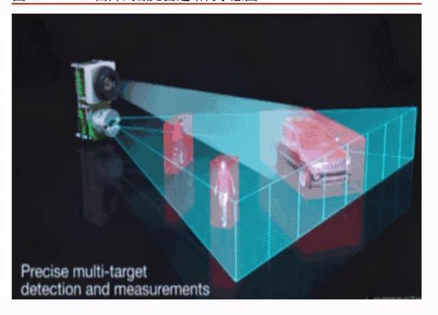 攝像頭方面,按視野覆蓋位置可分為前視、環視及內視攝像頭,其中前視攝像頭最為關鍵,可以實現車道偏離警示系統、前向碰撞預警系統、行人識別警示等功能。前視攝像頭又有單目攝像頭、雙目攝像頭,乃至多目攝像頭等不同的解決方案。雖然雙目或多目攝像頭具有更高的測距精度和更廣的視角,但由于其成本較高以及對精度和計算芯片的高要求,使得其仍未能大規模量產,目前以Mobileye的單目攝像頭解決方案是市場的主流。