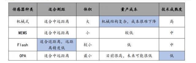根據結構,激光雷達分為機械式激光雷達、混合固態激光雷達和固態激光雷達。機械式激光雷達以一定的速度旋轉,在水平方向采用機械360°旋轉掃描,在垂直方向采用定向分布式搜集動態信息;混合固態激光雷達MEMS微鏡把所有的機械部件集成到單個芯片上,利用半導體工藝生產,不需要機械式旋轉電機,而是以電的方式來控制光束;固態激光雷達分為OPA固態激光雷達和Flash固態激光雷達,其中OPA技術原理與相控陣雷達類似,它由元件陣列組成,通過控制每個元件發射光的相位和振幅來控制光束,無需任何機械部件;Flash面陣式激光雷達不同于以上三種逐點掃描的模式,它利用激光器同時照亮整個場景,對場景進行光覆蓋,一次性實現全局成像。