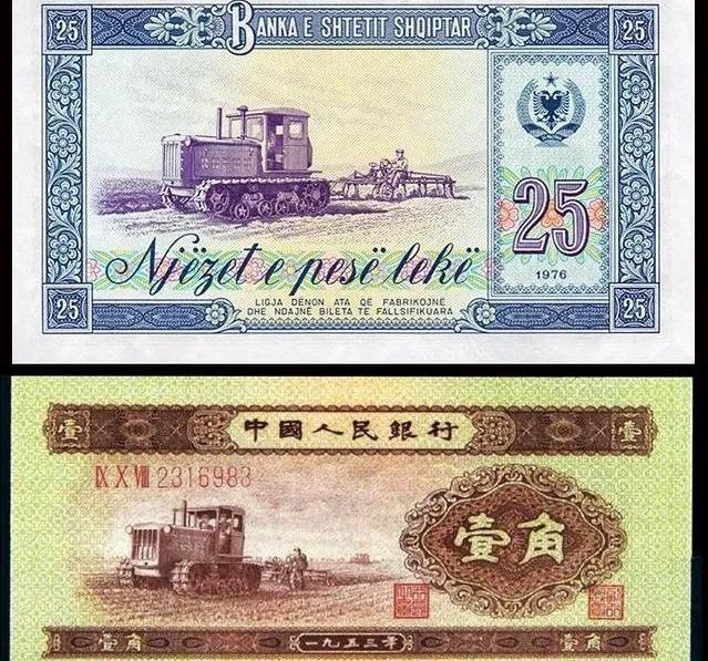 中國代印的阿爾巴尼亞25列克紙幣,同樣是「東方紅-54拖拉機」設計。