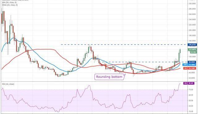在多頭將價格推高至80美元阻力位之后,萊特幣完成了一個圓角底部模式。此反轉設置的最低目標是136美元,僅低于145.6725美元的強勁阻力。