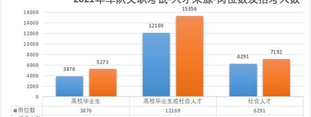 社會人才和高校畢業生都可以報考的崗位有15356個,招收人數多達12169人。只招高校畢業生的崗位共有5273個,招聘人數為3876人。社會人才報考,同等條件下課優先選擇要求“社會人才”來源的崗位,可以避免與應屆畢業生的競爭。