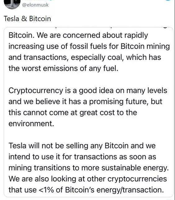 XRP/HKD-0.2%昨天,也就是本周三美股盤后,特斯拉CEO馬斯克突然在社交媒體宣布:“特斯拉已經叫停用比特幣購車。我們擔心比特幣挖礦和交易導致化石燃料、尤其是煤炭的耗用飛速增長,煤炭是所有化石燃料排放中影響最惡劣的。”