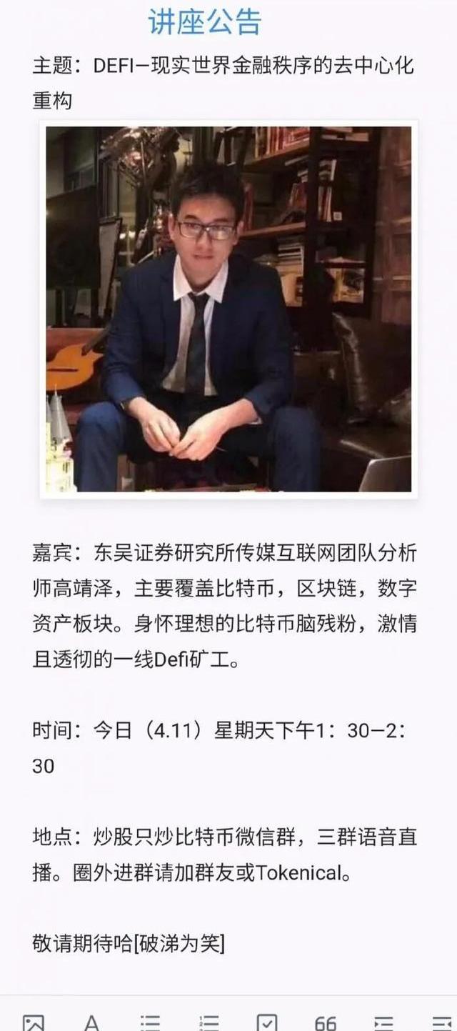 例如上面的高姓分析師,冒充券商分析師的人設,并稱自己2021年的主要工作方向就是向基金公司、保險公司等傳統金融機構普及數字貨幣和DeFi的相關知識,儼然一個向金融行業普及DeFi和數字貨幣的“傳教士”。
