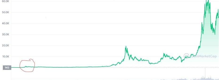 對于看到當前市場狀況并感到恐懼的人,我能給的最好建議可能是把眼光放得更長遠一點。每天甚至每個小時查看一次投資組合的余額會讓你發瘋,并且可能不會帶來任何好處。加密貨幣,特別是NFT,波動很大,但如果你對這個領域的長期前景有一些信念,那么很容易度過難關。我會給你留下兩個圖表來思考。這些都是BTC/USD的K線。第一張圖看起來像是崩盤/調整/熊市,第二張圖則是將時間線拉長了一點。