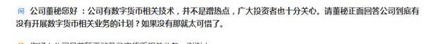 在投資者互動平臺上,2020年9月27日其回答投資者相關問題時回復:“公司目前暫無涉及數字貨幣相關業務”。到了2021年4月28日回答相關問題時,該公司的回復卻變成了“公司正在申請的‘數字貨幣錢包、交易法、交易系統和計算機存儲介質’目前處于審查過程中”。