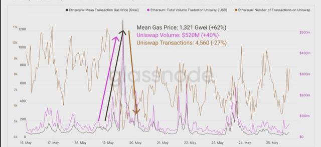 因此,雖然Uniswap的交易量很高,但在崩盤過程中,Uniswap的累計交易量沒有超過30天的平均交易量。相反,來自USDT轉賬、USDC轉賬、套利機器人的活動,以及在巨大的價格波動中的其他緊急活動占據了區塊空間。