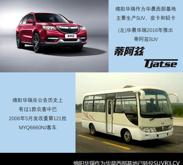 綿陽華瑞汽車有限公司前身則為四川省綿陽市輕型汽車廠,是四川省專用汽車定點生產廠,主要生產劍南牌MYQ5030XGD管道工程車、MYQ5020XDX電訊監測車等產品。上世紀90年代中期由新華內燃機廠兼并,世紀之交與綿陽市公汽公司、東風公司發動機廠聯合研制了12米三軸三開門前置雙燃料城市客車,東風公司定型為EQ6120PN城市客車,劍南廠虛擬型號為MYQ6120城市客車,在綿陽市多條公交線路上投運使用過,一度是客車圈里津津樂道的“神車”。2007年1月發改委第136批,企業更名為綿陽華瑞汽車有限公司,而如今華晨汽車旗下整車第33號的華晨汽車制造有限公司和華晨雷諾金杯汽車有限公司都擁有“四川省綿陽高新區朝陽東路17號”的生產地址,作為“工具人”的綿陽華瑞也正式結束歷史使命,成為集團資質整合的一枚棄子。