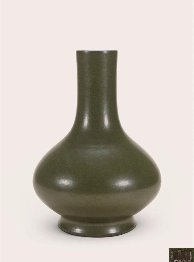 賞析:茶葉末釉原名廠官釉,是清雍正﹑乾隆時期御窯廠督陶官唐英在明代磁州窯所產黑釉器物基礎上的創新之作。其釉呈色穩定,因失透而顯莊嚴﹑沉穩;因窯變而形成黃綠變化,高雅精美。唐英《陶成紀事碑》記載廠官釉品種有三:蛇皮綠﹑鱔魚黃﹑黃斑點。后人習稱鱔魚青﹑鱔魚黃﹑茶葉末。此瓶造型圓渾飽滿,撇口,細長頸,溜肩,扁腹下垂,外侈圈足,因其狀如荸薺,故稱“荸薺瓶”,為清代的經典瓶式。器形規正,削足考究。釉面平整光潤,色澤深沉靜穆,盡顯大氣雅致,堪為陳設佳器。