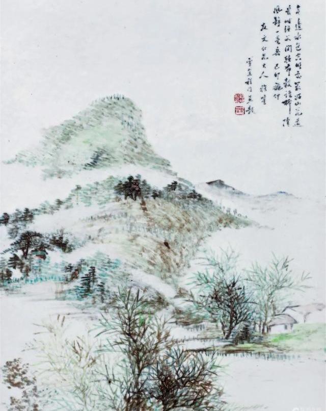 程門最擅山水,遠師宋元諸大家,近學清初四王,得宋人之嚴謹,元人之放達,四王之俊秀。他作為文人畫家在咸豐時就已經出名,經過南昌的游歷后名氣大振,掛籍御窯廠期間也熟悉了陶瓷料性,所以開始對陶瓷工藝進行改進,以達到文人畫的藝術表現形式。他運用渴筆枯墨皴擦勾勒的大寫意山水畫,運用偏鋒連勾帶皴,近于文人畫的寫意效果。