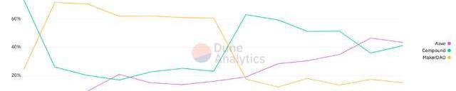 但是從借款總量趨勢來看,可以明顯看出AAVEV2總體是一個波動上升的態勢,反觀COMPOUND則是有下降的趨勢。為了看清AAVE目前在市場上的地位究竟如何,我們可以在dune上找到關于compound和AAVE的份額比較,如下: