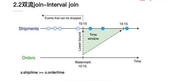 同時對于shiptime來說,其實它也設定了一個時間的下限,就是它必須要大于ordertime。對于Orders流來說如果接收到了一個10:15點的Watermark,那么Shipments的state10:15之前的數據就可以拋棄掉。所以Intervaljoin使得我們可以對于一部分歷史的state去做清理。
