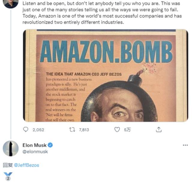 亞馬遜作為海外電商最大玩家,ToB運輸業務需求量巨大,而且貝佐斯又是馬斯克的長年死對頭,馬斯克在超越貝索斯成為世界首富時,還專門在推特上給他頒發了銀牌。